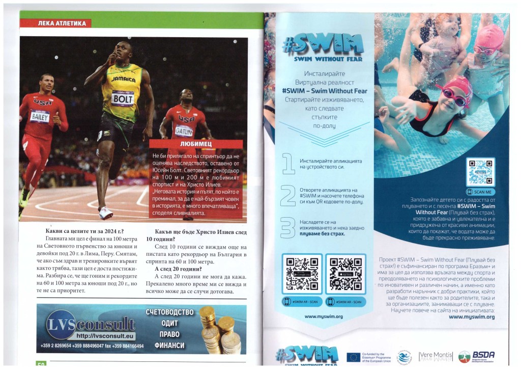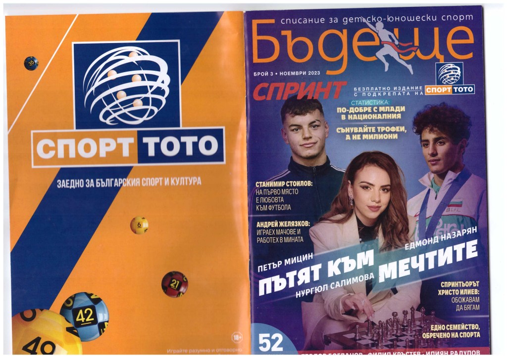 The free 50-page edition “FUTURE” is entirely dedicated to children and youth sports in Bulgaria. In 2023, this unique project for Bulgarian print publications published several issues, with the May and November editions featuring information about the #SWIM – Swim without Fear initiative. The magazine showcases young talents in Bulgarian sports, advocates for sports among adolescents in all its aspects – including organization and funding at the club, federation, and state levels; the educational role of sports; and the benefits of sports for young people. It is published with the support of the Bulgarian Sports Totalisator and distributed free of charge through the BST network.