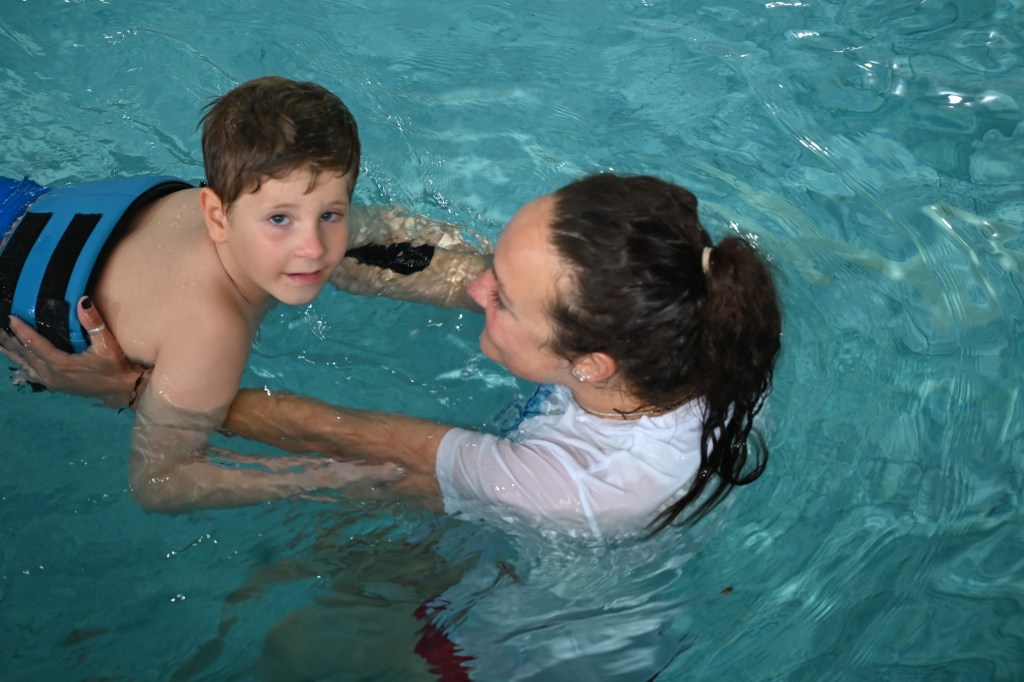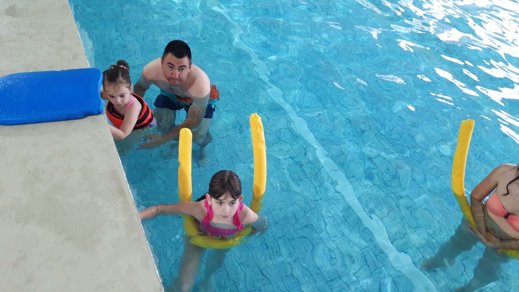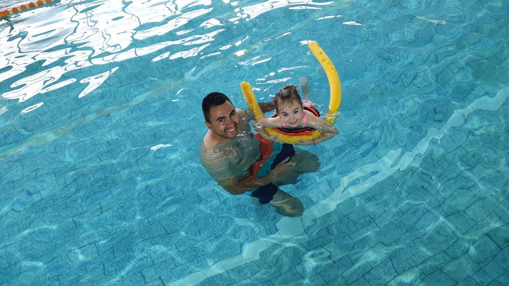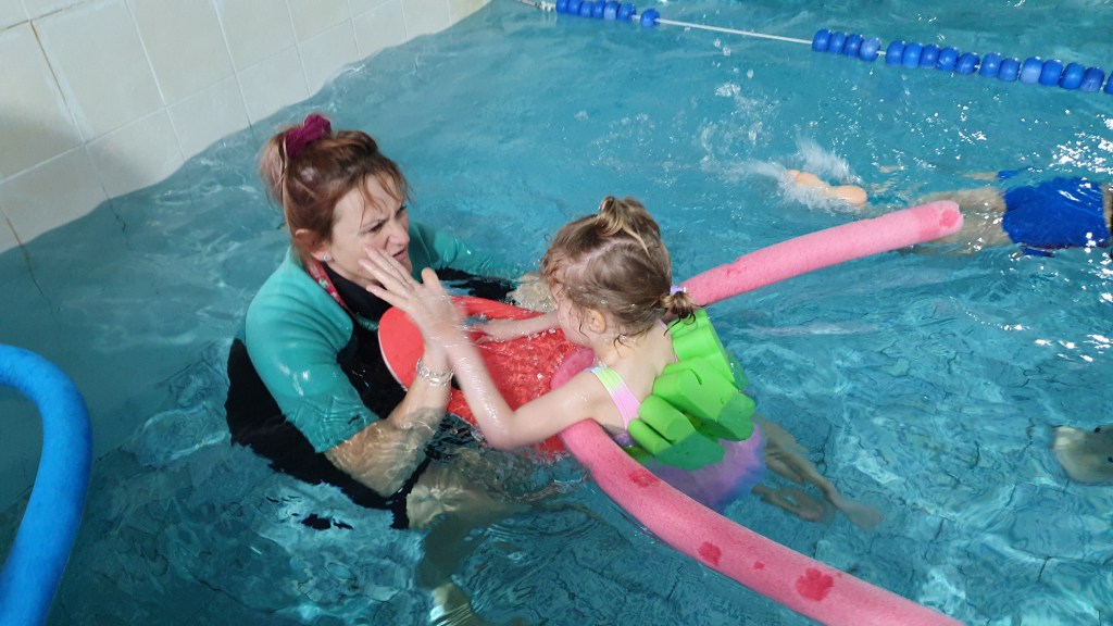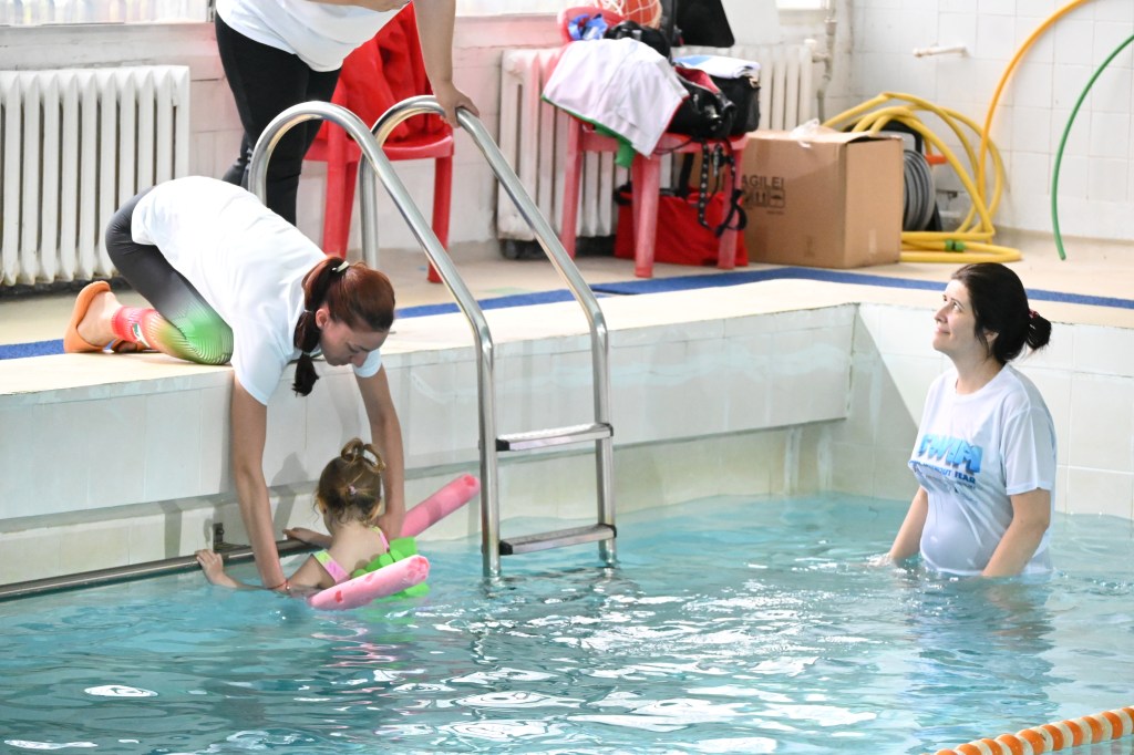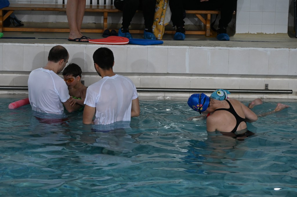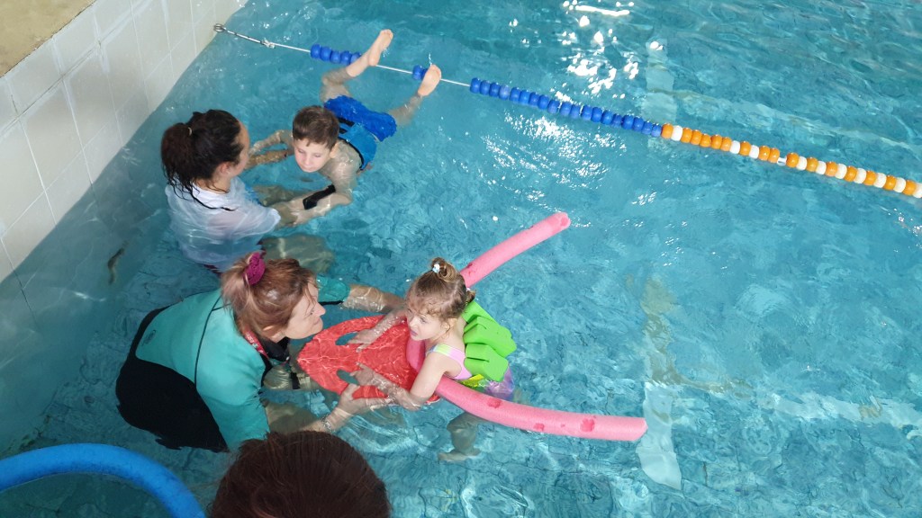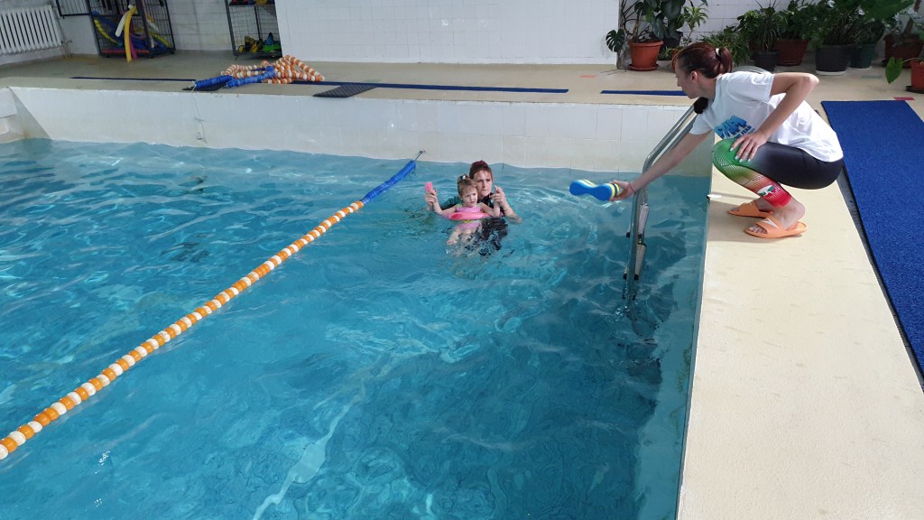 - Mastering very basic swimming skills – after overcoming the fear of water comes the turn of games in the water – with a ball, with a swimming belt, with an inflatable mattress;